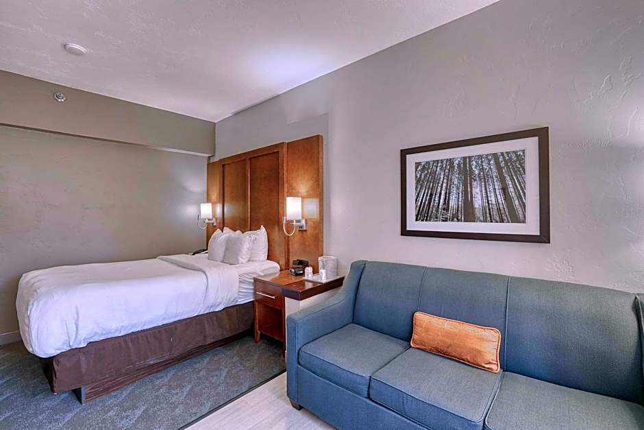 A 32-inch flat-screen TV is offered in this room, along with a separate living area, microwave and refrigerator.